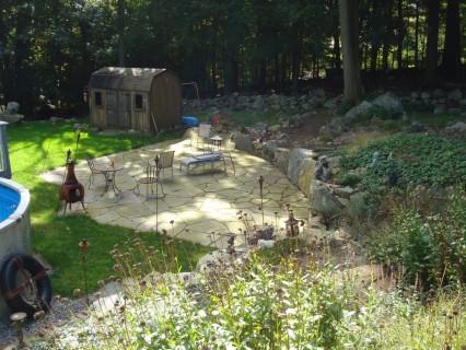 This poolside needed an accessible pathway, and the patio was designed for a table and chairs, outdoor fireplace and for performing Tai Chi. Stone wall and a brick walkway creates access for pool maintenance and was made from existing material that homeowner had already on site. We are happy to recycle materials and save resources.